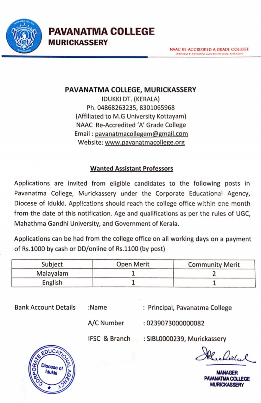 Applications are invited from eligible candidates to the following posts in Pavanatma College, Munckassery under the Corporate Educations' Agency, Diocese of Idukki. Applications should reach the college office within one month from the date of this notification. Age and qualifications as per the rules of UGC, Mahathma Gandhi University, and Government of Kerala.